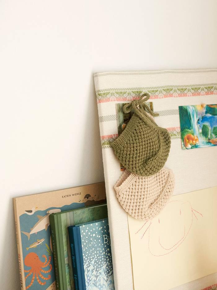 The pattern includes a pattern for April Cardigan, April Diaper Pants and April Bonnet.