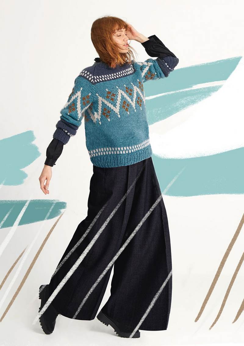 Nr 2 – Blåfjell sweater has a loose neck and is knit from the bottom up in FRITIDSGARN.