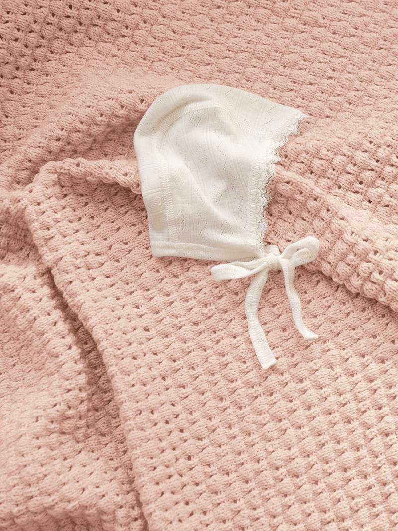 The blanket is knitted back and forth with ribbed edges, the other stitches are knitted with a pattern according to the diagram. Knitted in Babyull Lanett.