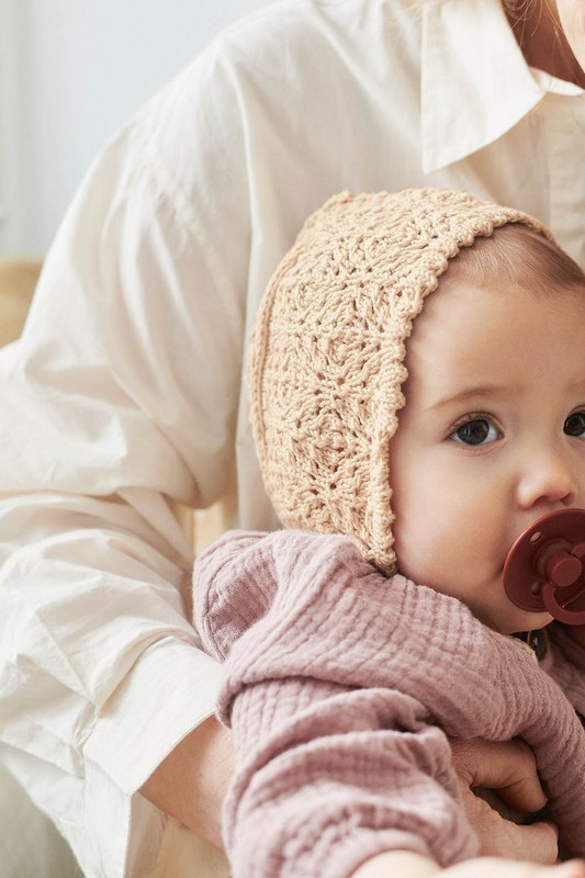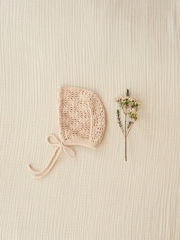 The bonnet is knit back and forth, with a lace pattern according to diagram. Knit the sides together with the back of the head, and finally knit up more stitches
