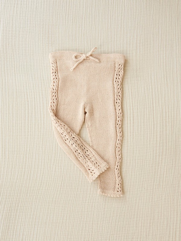 Tight-fitting tights with a lace pattern along the sides. The tights are knit from top to bottom. Short rows shape the trousers higher at the back, and increase to the wedge between the legs.
