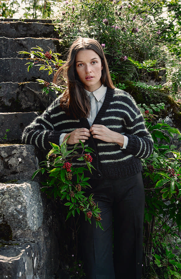 Pattern Book 2013 – Pattern Nr. 8 – Striped cardigan with V-neck and drop shoulder, knit in SUNDAY and TYNN SILK MOHAIR