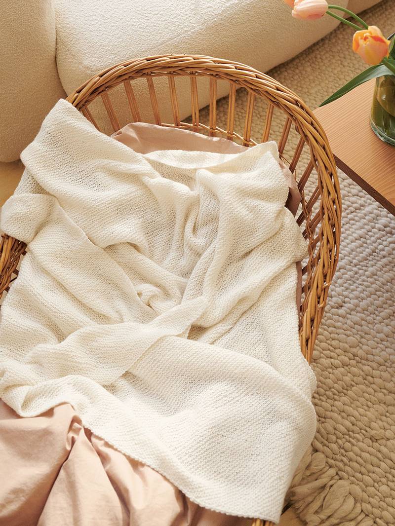 The blanket is knitted back and forth in garter stitch, at the same time as stitches are increased, stitches are cast off. Knitted in Alpakka Silke.