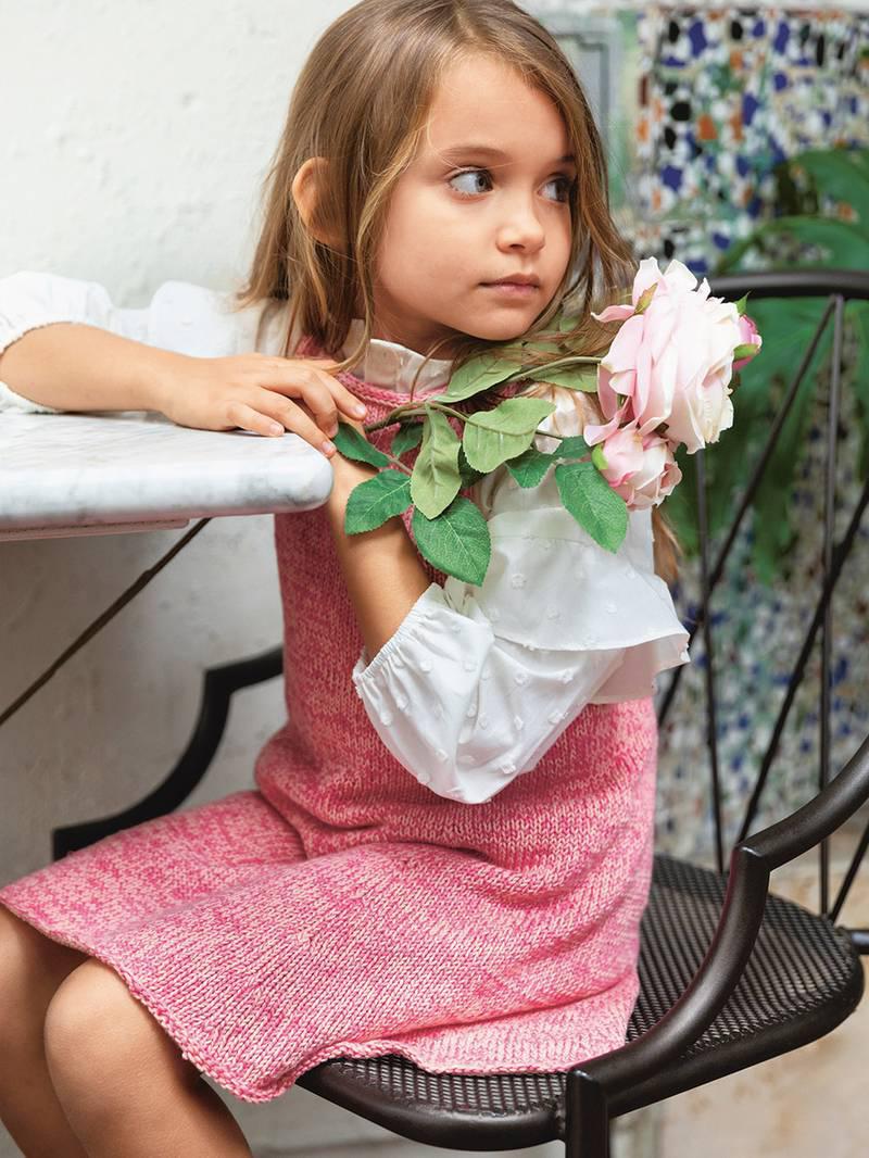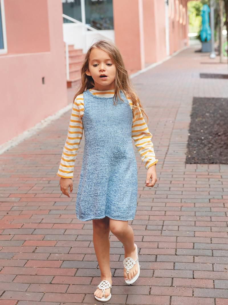 The dress is knitted bottom-up in stockinette stitch with 1 strand of Mandarin Petit and 1 strand of Tynn Line.