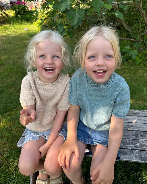 The Poppy Tee Junior is worked from the top down. First the top part of the back yoke is worked with increases, then the shoulders are worked from stitches that are picked up and knitted along the slanting sides at the back yoke. Stitches are then picked up and knitted along the sides of the shoulders and the rest of the yoke is worked together on the circular needle, first back and forth and then in the round. The body is worked in the round on a circular needle, and the sleeves are worked in the round on double-pointed needles or on a circular needle using the Magic Loop technique. At the end a folded neck edge with built in double knitting is worked.