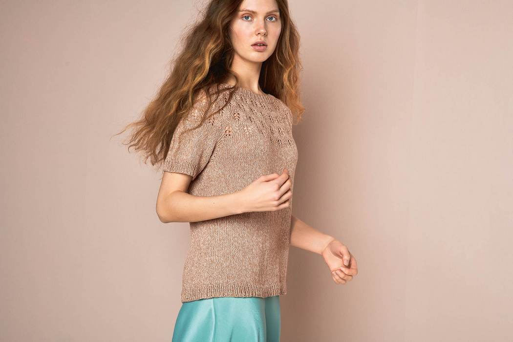 This is a pattern set that includes the single pattern for the Snow Clock top [from Sandnes Garn Catalog 2104 Women’s Summer] and Sandnes Garn Line yarn for the pattern. Sweater is knit top down.